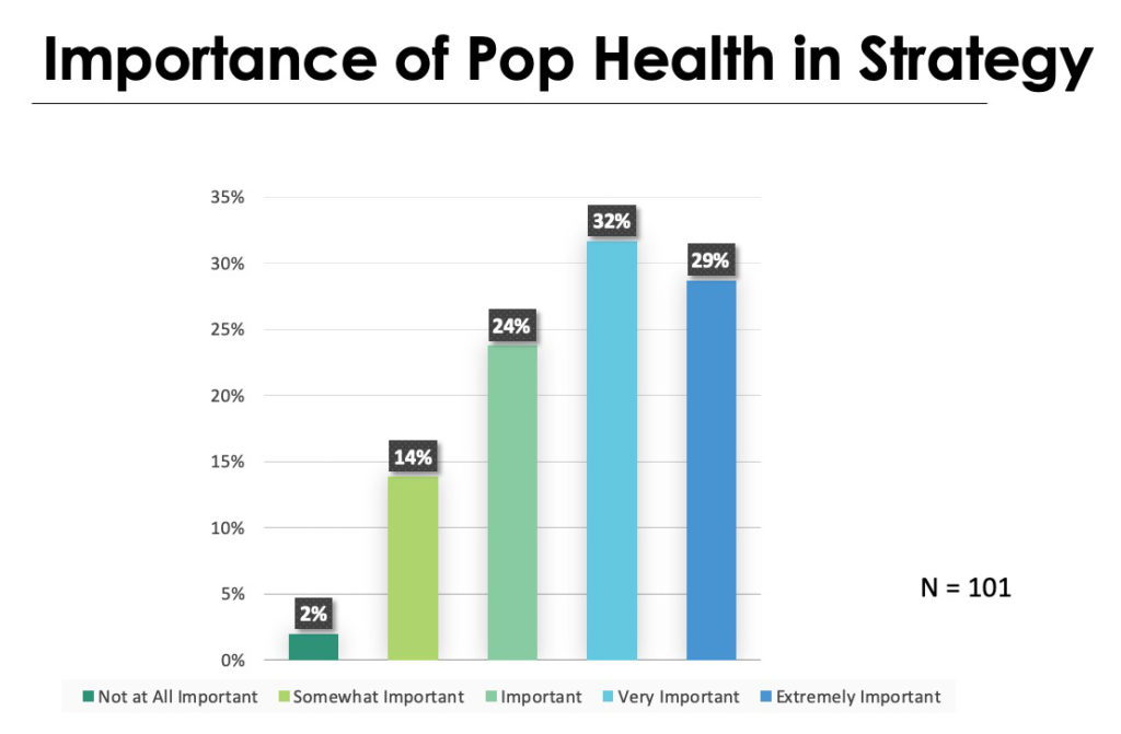 As VBC continues to grow, driving innovations and new risk arrangements, population health remains a high priority. In a 2019 Health Catalyst poll of 101 healthcare leaders from across the U.S., over 60 percent responded that population health was either very important or extremely important (Figure 1). Only 16 percent said it was somewhat important or not at all important. So, very clearly, and despite its changes and dynamics, population health remains a high national priority.