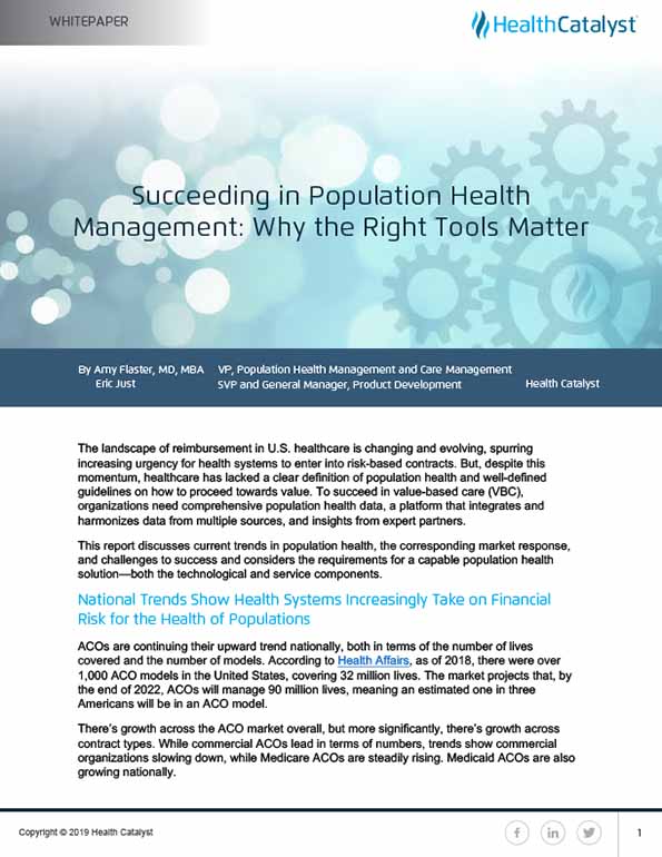 The landscape of reimbursement in U.S. healthcare is changing and evolving, spurring increasing urgency for health systems to enter into risk-based contracts. But, despite this momentum, healthcare has lacked a clear definition of population health and well-defined guidelines on how to proceed towards value. To succeed in value-based care (VBC), organizations need comprehensive population health data, a platform that integrates and harmonizes data from multiple sources, and insights from expert partners.