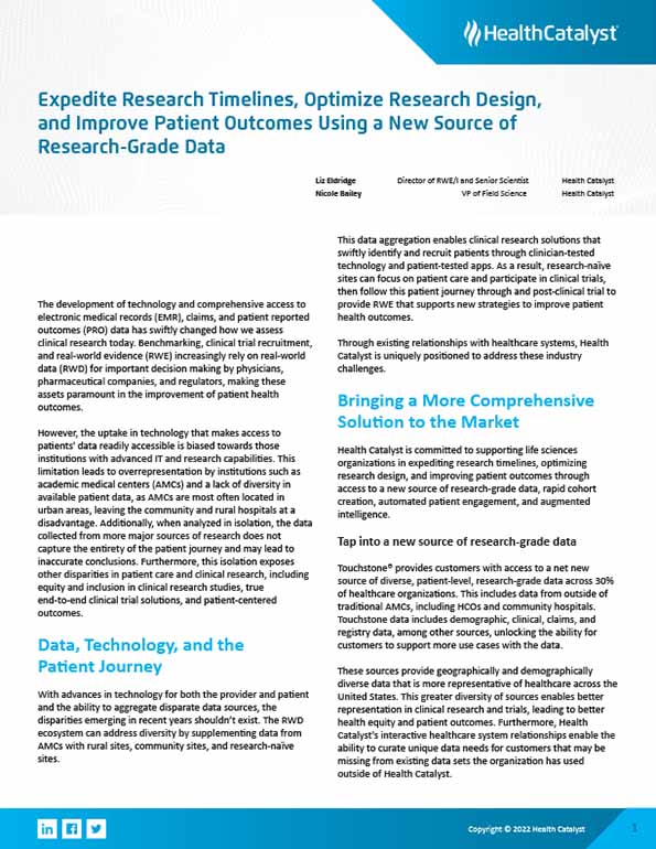 These data sources provide geographically and demographically diverse data that is more representative of healthcare across the United States. This greater diversity of sources enables improved representation in clinical research and trials, leading to better health equity and patient outcomes. Furthermore, Health Catalyst’s interactive healthcare system relationships enable Touchstone to curate unique data needs for customers that may be missing from existing data sets generated outside of Health Catalyst.
